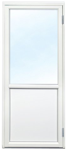 Aluminiumbeklädd fönsterdörr i 3-glas med mycket god isoleringsförmåga (2 st lågemissionsglas (LE)). Möjlighet att linjera dörrarna (anpassa glashöjd och spröjs) med vridfönster och fasta fönster.