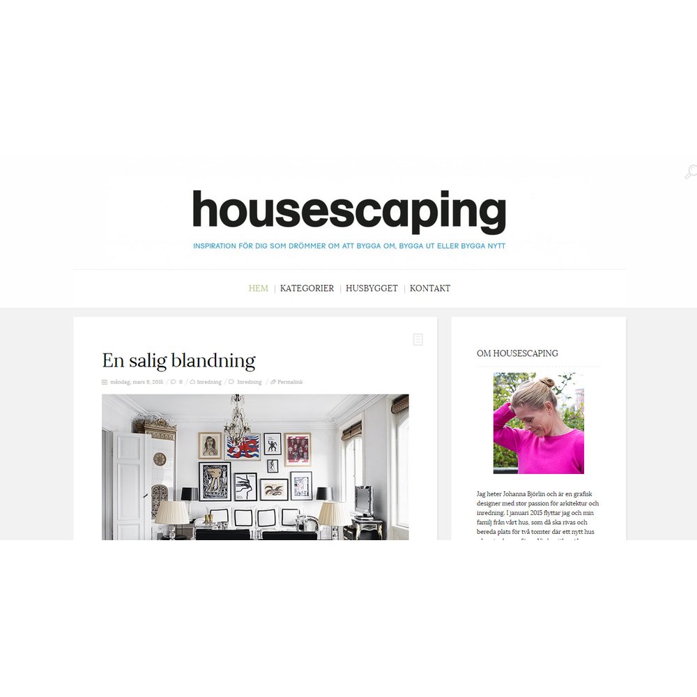 I bloggen Housescaping berättar Johanna om när familjen flyttar ur sitt hus som ska rivas för att bereda plats för två tomter. På varje tomt ska familjen upprätta ett hus varav det ena ska säljas och det andra ska bli familjens nya hus att bo i. Det märks att Johanna har öga för färg, form, arkitektur och inredning. Bilderna är drömska och oavsett om du ska bygga nytt, bygga ut eller drömmer om att göra det så blir man i allra högsta grad inspirerad när man läser bloggen. En självklar kandidat!