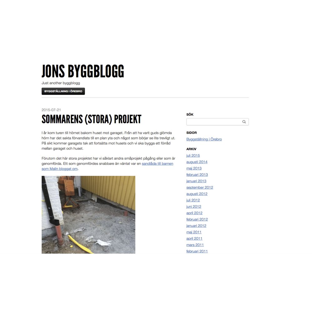 Jon bygger ut och bygger om och vi har kunnat följa honom i Jons byggblogg under årens lopp när huset har växt från 83 till 170 kvadratmeter. Än är det dock inte helt klart det finns många fler projekt på gång ett av sommarens största är garaget och dess omgivning. Bloggen har massor av bilder som ger inspiration och näring till idéer om hur man kan göra med sitt eget byggande det är bara att kika i arkivet eller gå in på någon av kategorierna t ex garage, tak eller golvvärme.