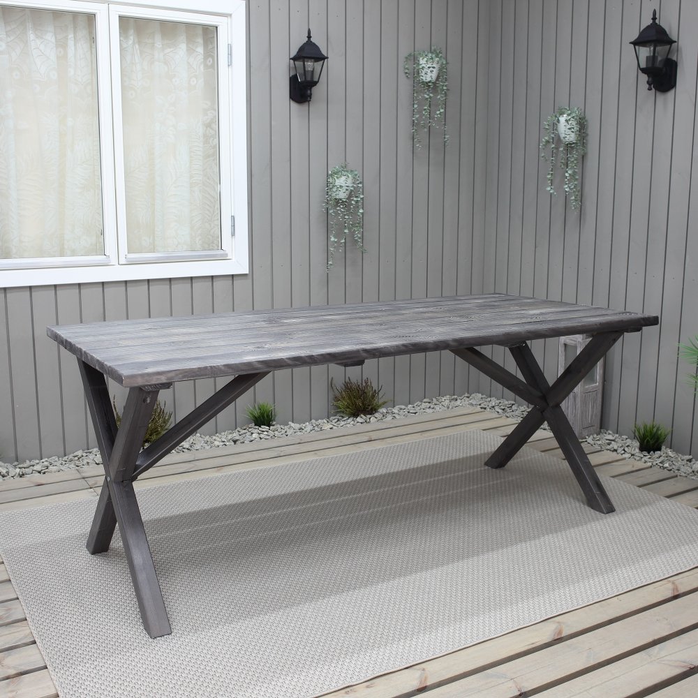 Bordet Scottsdale imponerar med sin robusta konstruktion och sitt rustika uttryck. Tillverkat i massivt trä och behandlat för hand för att få en patinerad, väderbiten look, ger det en varm och inbjudande känsla till uteplatsen. Varje bord har sitt eget unika utseende med naturliga variationer i träets struktur och färg, vilket bidrar till dess personliga charm. Kryssbenen förstärker den rustika känslan och ger stabilitet för alla tillfällen – från vardagsmiddagar till sommarfester.