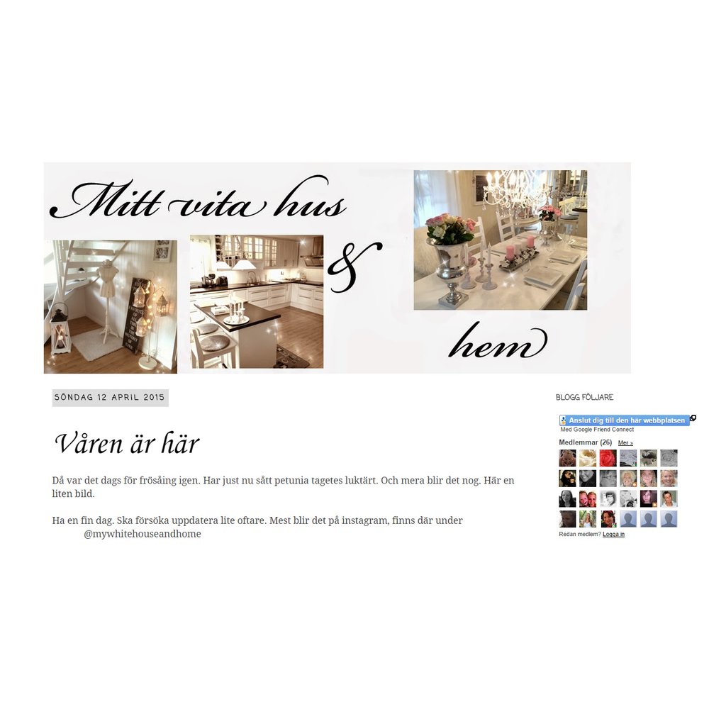Mitt vita hus & hem är en inspirerande och hemtrevlig blogg som drivs av en norsk kvinna som är bosatt i Sverige med sin man. Här får vi ta del av bilder från vardagslivet, läsa om inredning och trädgård, samt tips på mat och bakverk som tillagas i det fantastiska köket! Rosa, vitt, silver och lantligt är ledorden för den här bloggen och alla fina foton levererar en glad stämning. Mitt vita hus & hem har en självklar nominering till Bästa Husbloggarna!