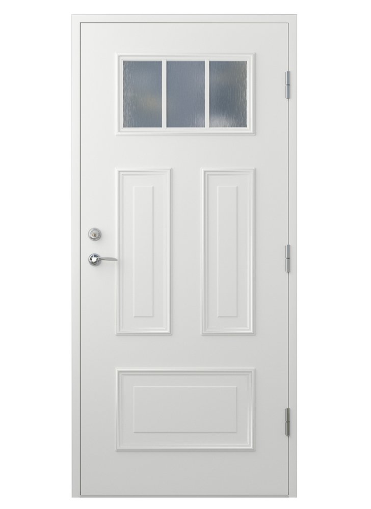 Ytterdörr Annette med glas har ett klassiskt vackert formpressat listverk som bildar speglar och ramar in dörrens rektangulära fönster. Här kan du själv välja om du vill kunna se vem som kommer och hälsar på genom att välja klarglas, eller om du föredrar insynsskyddat och i så fall kan du välja frostat glas eller cotswoldglas med lite mer karaktär. Denna klassiska dörr med enkla spröjs lämpar sig oerhört fint till den klassiska, såsom den traditionella eller moderna arkitekturen.