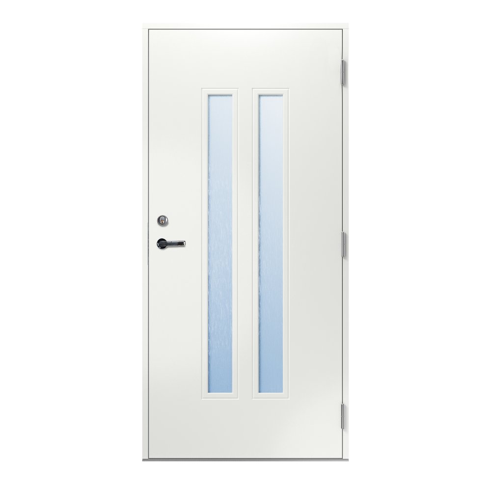 - Stomme: Konstruktion i furuträ med 50 mm värmeisolering, samt 0,5 mm aluminiumplåt på både in och utsida av dörren.