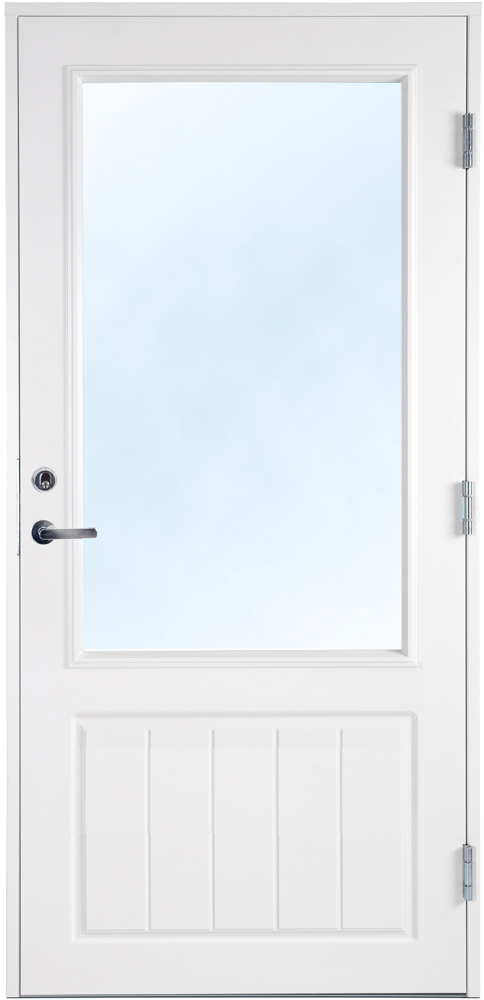 Dörren är dekorerad nedtill på både in- och utsida. Fönstret är en 2-glas isolerruta med Argon vilket ger ett lågt U-värde.