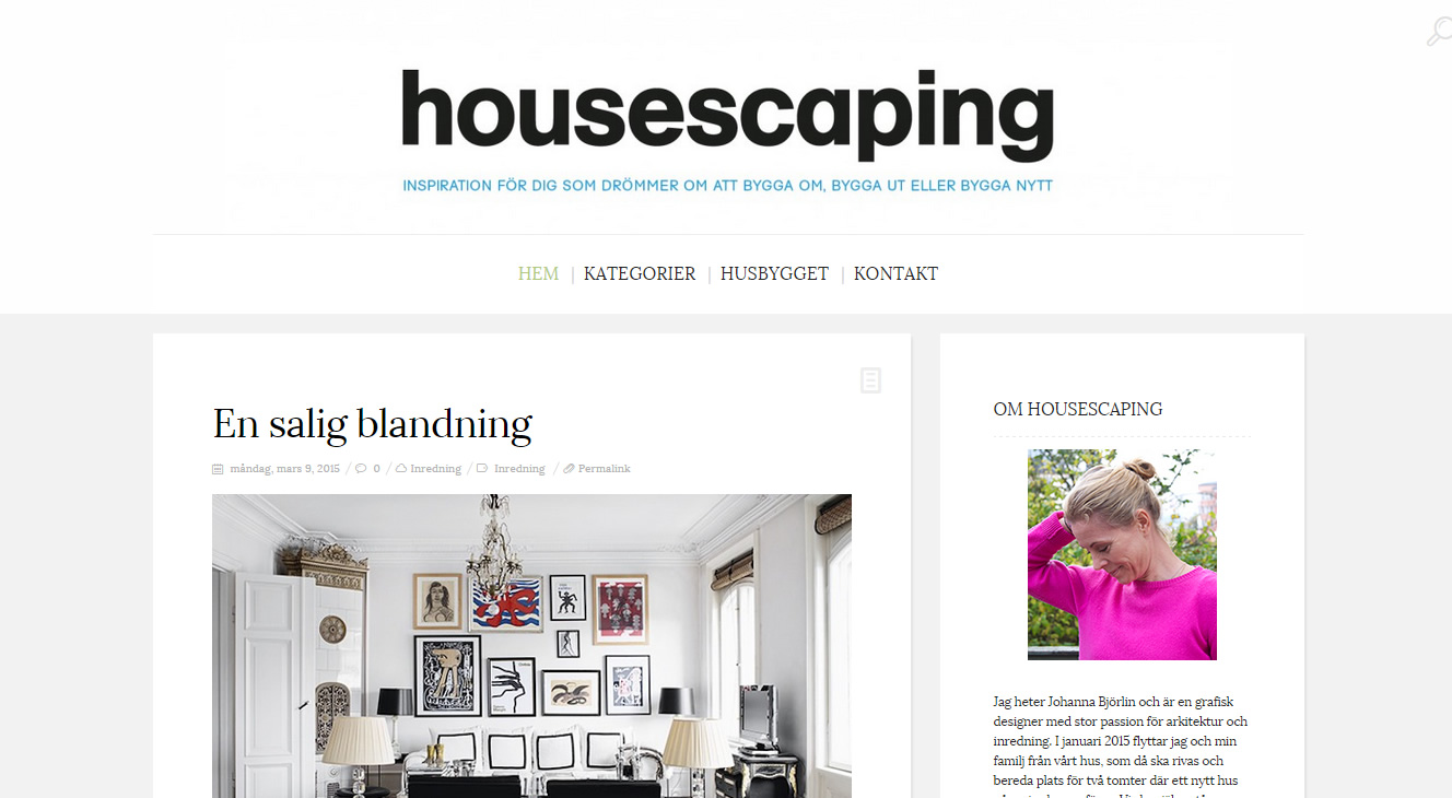 I bloggen Housescaping berättar Johanna om när familjen flyttar ur sitt hus som ska rivas för att bereda plats för två tomter. På varje tomt ska familjen upprätta ett hus varav det ena ska säljas och det andra ska bli familjens nya hus att bo i. Det märks att Johanna har öga för färg, form, arkitektur och inredning. Bilderna är drömska och oavsett om du ska bygga nytt, bygga ut eller drömmer om att göra det så blir man i allra högsta grad inspirerad när man läser bloggen. En självklar kandidat!