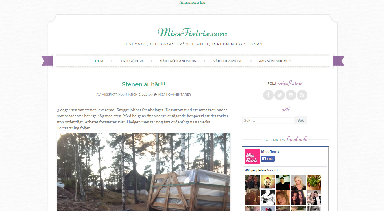 I bloggen Missfixtrix får vi följa Johanna som skriver om allt ifrån inredning till husbygge, det vi fastnade mest för i Johannas blogg är hennes bredd och förståelse för vad som passar ihop designmässigt. Bloggen handlar dels om processen att bygga familjens sommarhus på Gotland samt arbetet med familjens nybyggda hus utanför Stockholm.