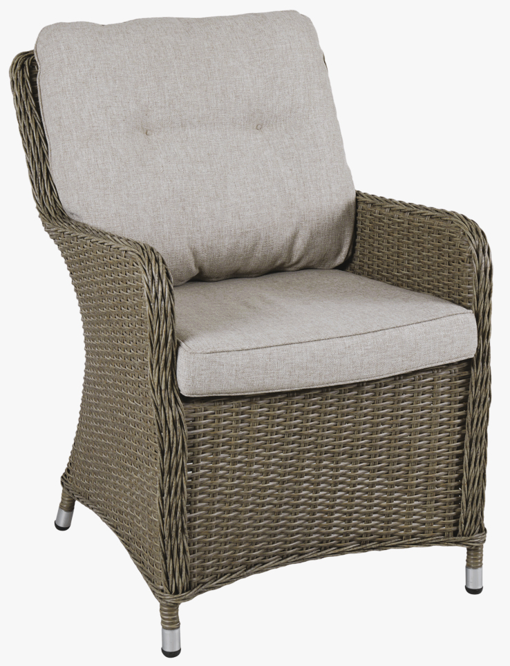 Hela gruppen är byggd för att stå emot väder och vind. Den väderbeständiga konstrottingen kräver minimalt underhåll och håller sig snygg länge, medan olefintyget på dynorna torkar snabbt och står emot både fukt och UV-strålar. Det eleganta matbordet med 150 cm i diameter skapar en naturlig samlingspunkt i trädgården eller på altanen.
