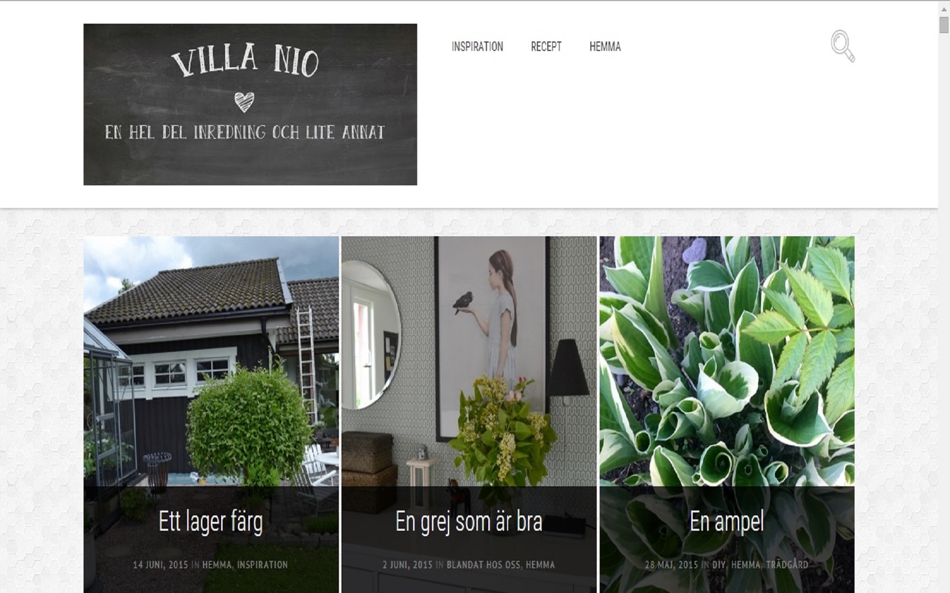 I bloggen Villa Nio skriver Annika om inredning, mat, trädgård, och träning. Vi får även ta del av en drös med olika spännande recept på t.ex. snickersglass och kycklinggratäng, samt massvis med snygga bilder på Annikas smakfulla hem. Några DIY- och boktips får också plats i den stilrena bloggen. Villa Nio innehåller allt och lite till, man fastnar lätt och fortsätter att klicka sig vidare genom arkivet och man blir inte besviken!